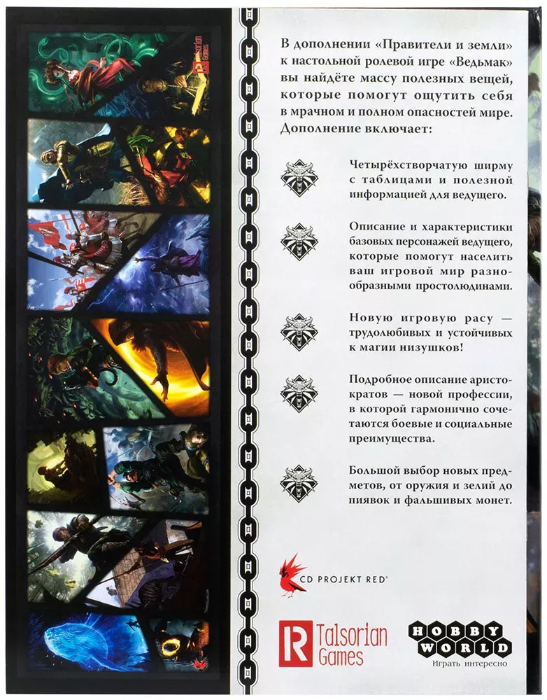 "Правители и земли" - дополнение к настольной ролевой игре "Ведьмак". Новые компоненты сделают ваш игровой процесс еще насыщенней и многогранней. Для ведущего даже есть новая ширма. Описания и черты персонажей разбавят суровый мир простолюдинами и существами из новой расы. В целом, вселенная приобрела еще больше деталей, которые сделали ее больше и ярче.